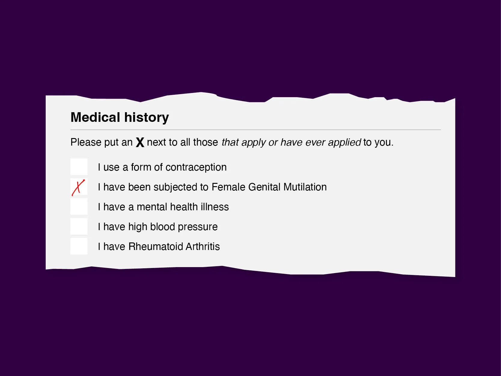 Currently, a healthcare professional will only ask verbally if a woman has been subjected to FGM/C, and only if they suspect something, or feel there is a reason to do so. This may be based on findings from a physical examination or from information provided by the patient. More than half of the survivors we work with reported not being asked this question, and a further 72% reported that they had never received healthcare support because of FGM/C.